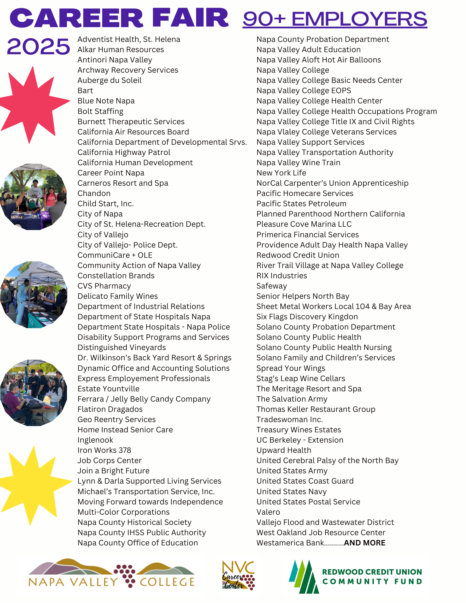 The Career Center at Napa Valley College is a student support service that provides a variety of career readiness services to Napa Valley College Students and Alumni. Whether you need help discovering your career interests (take a career assessment), learn about various job fields, refresh your resume, or start a job or internship search, we are here to help! Please email us for any of your career needs.